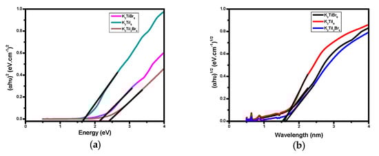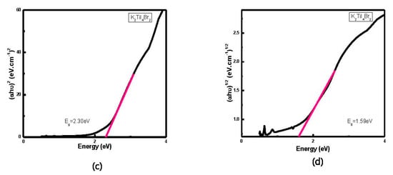 Bandgaps for the perovskites are calculated by Tauc plots (Figure 4). K2TiI6 has direct bandgap of 1.62 eV and K2TiBr6 has direct bandgap of 2.14 eV (Figure 4a). Indirect bandgaps of K2TiI6, K2TiBr6 are 1.50 eV and 1.54 eV respectively as given in Figure 4b. The samples have quasi-direct bandgaps, since the difference between direct and indirect bandgap is very small (<30 meV). These values are in accordance with the theoretical studies published in various research articles [32,33]. The distinct difference in bandgaps of K2TiI6 and K2TiBr6 is due to Halide atom p- orbitals dominating VBM, while Ti-3d orbitals dominate CBM. The effect of halide atom ionic radius variation affects the CBM edges, and it increases the bandgap from Br to I. The 4 s orbitals of K contribute nothing to the VBM and CBM edges [32]. Direct bandgap of K2TiI6 is conducive to be an absorber in single junction solar cell. Large bandgap perovskite K2TiBr6 can be employed in multi-junction solar cell, in tandem with low bandgap absorbers like silicon [35,36]. K2TiI2Br4 has the direct bandgap of 2.44 eV (Figure 4a) and K2TiI4Br2 has bandgap 2.30 eV as represented in Figure 4c. Indirect bandgap of K2TiI2Br4 and K2TiI4Br2 are 1.58 eV and1.59 eV respectively (Figure 4d). Here, K2TiI2Br4 has a larger bandgap compared to K2TiI4Br2. Evidently, mixed halide perovskites have wide bandgap which can be tuned easily by changing the chemical composition of halides.