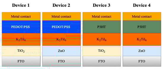 Parameters for K2TiI6 are from experiment carried out and from computational studies by various researchers. Two different electron transport layers (ETLs) and a Hole Transport Layer (HTL) are chosen [44,45,46,47,48,49] to optimize device configuration, for obtaining maximum efficiency. TiO2 and ZnO are the most widely used ETL, whose wide bandgap helps with higher extraction and transportation of electrons from perovskite layer to ETL. Commonly used HTL poly(3,4-ethylenedioxythiophene) polystyrene sulfonate (PEDOT: PSS) and Poly(3-hexylthiophene) (P3HT), possessing high hole mobility and stability are employed to study the performance of the perovskite K2TiI6 as absorber. Significant qualities, such as the low cost and easy deposition process, of these transport layers are highly desired over widely used HTL (Spiro-MeOTAD) and ETL (SnO2). The following are the four devices: Device 1- FTO/TiO2/K2TiI6/PEDOT: PSS/Metal contact, Device 2- FTO/ZnO/K2TiI6/PEDOT: PSS/Metal contact, Device 3- FTO/TiO2/K2TiI6/P3HT/Metal contact and Device 4-FTO/ZnO/K2TiI6/P3HT/Metal contact, to be studied in detail, and represented schematically in Figure 7. With the inclusion of defect density to all the layers, the results are obtained as shown below.