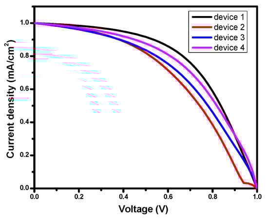 Current density versus voltage plot for 200 nm thickness of absorber layer in the devices 1, 2, 3 and 4.