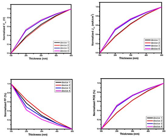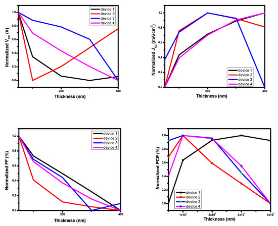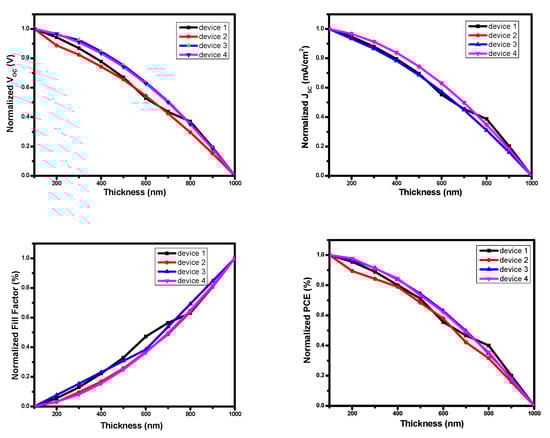 Voc, Jsc, fill factor and PCE of devices 1, 2, 3 and 4 for different absorber layer thickness.