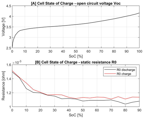Li-ion NMC cell (A) open circuit voltage and (B) charge/discharge static resistance.