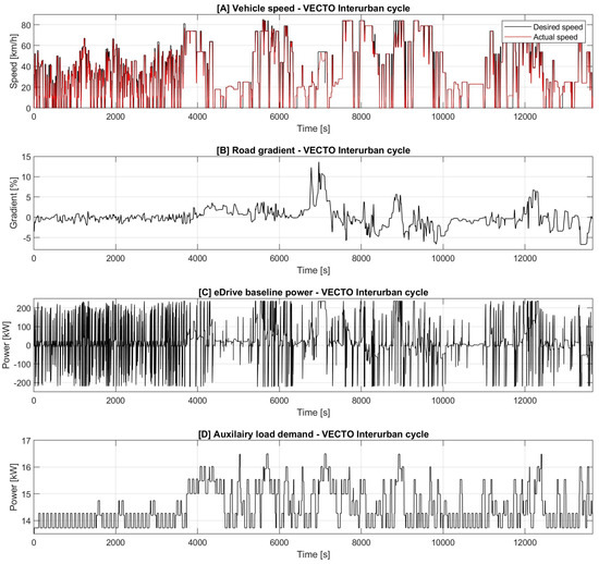 Thr interurban mission profile derived from the European Commission VECTO simulation tool comprising urban and interurban driving scenarios has been used for the current optimal powertrain sizing activity [22,23]. Figure 3 shows distance-based interurban speed recommendations and actual speed following VECTO acceleration limits along with road gradient and the power drawn by the eDrive and auxiliary loads (baseline sizing dimensions given in Section 4).