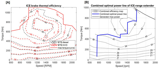 (A) Diesel and HVO ICE brake thermal efficiency comparison: map modified for HVO fuel with slightly greater efficiency at higher loads. (B) ICE–generator combined efficiency map with the optimal power line to be followed for minimal fuel consumption (diesel and HVO).