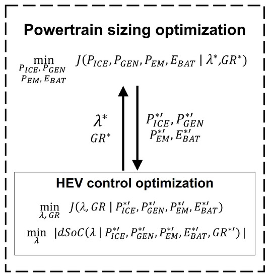 In the chosen co-design optimisation approach, the control design is nested within the plant design, requiring its consistent performance for a given solution before comparing the minimal cost function for that size with other feasible options to find the final powertrain sizing optimum (Figure 5) [32].