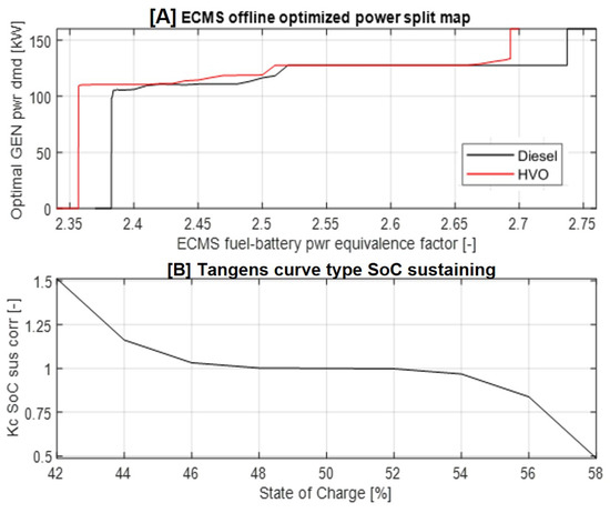 The offline optimised power split map is then implemented in the full powertrain model used for sizing optimisation (online), with the end of mission battery SoC sustaining targeted to find the most fuel-efficient fixed value ECMS equivalence factor for a specific cycle [37]. Safety against battery overcharging/discharging and SoC sustaining is further assured using a less intrusive tangens type SoC equivalence factor adaption coefficient (Figure 6) [42,43,44]. Highly intrusive control on SoC sustaining is avoided to let the ECMS strategy work in the most efficient manner, which may lead to a slight variation in end-of-cycle SoC (Section 4.6). Instead, the corresponding effect on fuel usage is taken into consideration by calculating equivalent fuel consumption based on SoC surplus or depletion (Section 3.3.1 and Section 3.4.4).