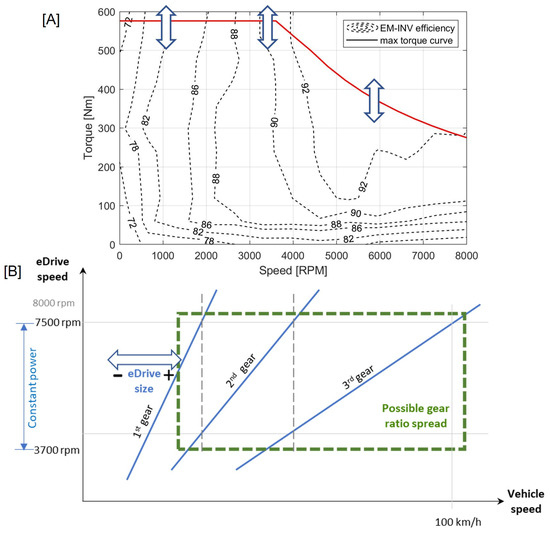 (A) eDrive electrical efficiency map with sizing based on maximum torque curve. (B) Traction chain sizing methodology including the effect of eDrive scaling on possible gear ratio search space.