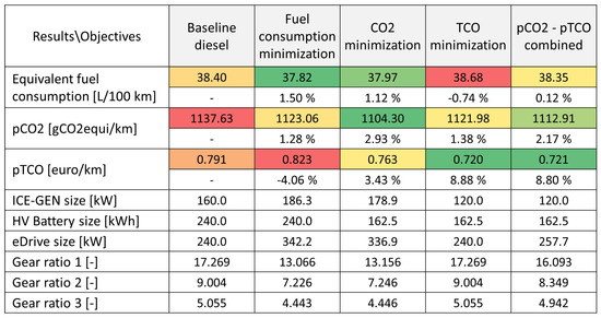 Quantitative comparison of diesel–fueled powertrain size solutions running on VECTO interurban cycle focused on minimisation of fuel consumption, carbon footprint (), lifetime costs () and environmental-economic balanced objective (−) against the baseline case. The corresponding choice of optimised powertrain dimensions have also been listed.