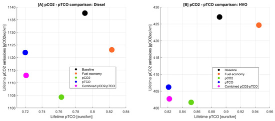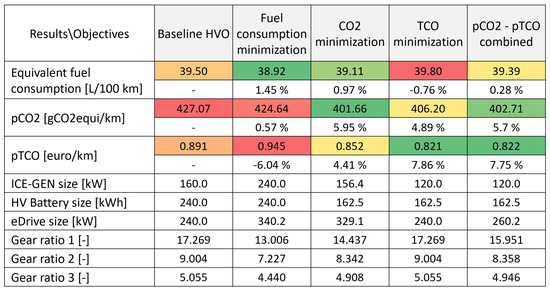 Quantitative comparison of HVO–fueled powertrain size solutions running on VECTO interurban cycle focused on minimisation of fuel consumption, carbon footprint (), lifetime costs () and environmental-economic balanced objective (−) against the baseline case. The corresponding choice of optimised powertrain dimensions have also been listed.