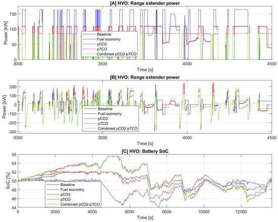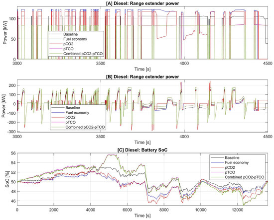 The upper limit of the ICE—generator range extender size (, ) is set to match the maximum possible eDrive size considering manufacturer recommendations, while the lower limit is set by the ability to sustain battery SoC at the end of VECTO interurban and coach drive cycles (Table 4). The upper bound of the HV battery size (240 kWh) is added from vehicle integration constraints and manufacturer recommendations, while the lower bound (160 kWh) is set by the previously discussed 100 km ZUEZ urban driving range requirement, which has been tested on the detailed distance-based forward simulation model under extreme ambient conditions (40 C).