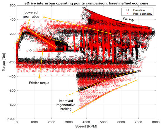 The spread of the three gear ratios has to be limited to assure consistent and uninterrupted delivery of maximum wheel torque (maintain eDrive operation in constant power region) when shifting between gears (Figure 7). Thus, the lower bound of the middle gear ratio is dependent on the selected value of the third gear ratio, while the upper bound of the middle gear ratio depends on the chosen value (lower bound) of the first gear ratio, which in turn is affected by the chosen eDrive size (Table 4) [50]. Choice of the middle gear ratio also affects the lower bound of the third gear ratio (rotational speed of the eDrive during high-speed cruising) for maintaining the above-mentioned smooth operation. In general, a larger eDrive size has been found to relax the search space of the first gear and thus also the middle and third gear ratios. This helps maintain continuous maximum wheel torque delivery between gear changes and avoid gear hunting while also better controlling the placement of eDrive operating points towards high-efficiency zones. Optimal eDrive sizing will shift the operating points vertically in the efficiency map and improve the scope of regenerative braking, while gear ratio tuning will help in better operating point placement, both vertically and horizontally in the eDrive efficiency map (Figure 7 and Section 4.7).