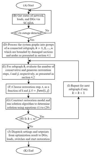 In this section, we present the mathematical formulation of the restoration problem. The nomenclature and parameters of the method are shown in Table 1. Decision variables are denoted with a hat. The flowchart of the proposed restoration model is shown in Figure 1. As shown in the step labeled D on the flowchart of Figure 1, the distribution system will be divided into a set of connected subgraphs whose boundaries are necessitated by damaged sections and nodes rather than simply by the control requirements of the master DGs as popularly modeled. This way, each subgraph is controlled to be restored as one microgrid system with more redundancy and resilience. Each subgraph is processed and solved as a separate system. The restoration model that follows presents how a typical subgraph is modeled as a MILP problem.