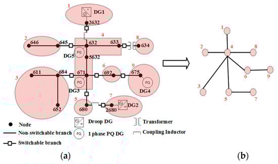 Illustration of Bus Block Reduction, (a) Modified IEEE 13 Node Test Feeder, (b) Bus Block Equivalent.