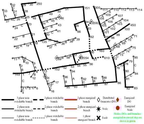 Initially, all of the elements are set in a de-energized state which is why the elements are shown in black and white for now in Figure 3. Two three-phase droop-controlled DGs are present at nodes 2054 and 2063 (these two nodes are extra nodes added to the IEEE 123 node test system to represent the additional nodes due to the inductor coupling of the droop DGs which help to decouple the active and reactive power control). Three single-phase PQ dispatchable DGs are situated at nodes 34, 46, and 59, and a single-phase non-dispatchable renewable DG is situated at node 68. The details of the DGs are shown in Table 2. The DGs have a total active power capacity of 2680 kW and a reactive power capacity of 1480 kvar for all three phases combined. Line ampacity constraints have been ignored.