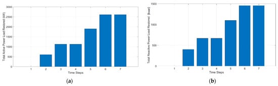 Total load value restored per restoration steps, (a) active power loads (b) reactive power loads.