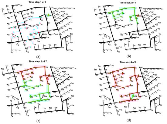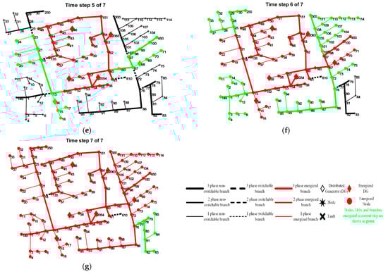 The loads were restored sequentially and coordinated with the single-phase DGs to balance the load unbalance in the system according to the system unbalance constraints. The load restoration results are summarized in Figure 4 with the total loads restored per step shown with the bars. The one-line diagram of the restoration sequence showing only the restoration of nodes, branches, and DGs is shown in Figure 5. Notice a fully interconnected microgrid is restored. In step 4 (Figure 5) when the second droop-controlled DG is restored, the total loads restored remained the same as in the previous step in accordance with the synchronization enhancing constraints. Additionally, there is no additional load restored in time step 7 (compared to time step 6) because none of the loads in the last restored bus block was energized. Even though the last bus block was energized, the loads in that section, which are switchable, remained de-energized to maintain the DG capacity and phase balancing constraints. Notice that the total restored loads of 2610 kW and 1455 kvar (Figure 4) are quite close to the total DG capacity of 2680 kW and 1480 kvar for all three phases combined (see Table 2).