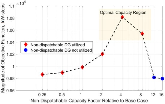 The incorporation of non-dispatchable renewable energy DG in restoration is a major concern because of the intermittent nature of its supply. The performance of the restoration method with non-dispatchable DG is evaluated by varying the output capacity of the non-dispatchable DG of the base case with a factor ranging from 0.25 to 16 and observing how this affects the objective value. The change in objective function magnitude with non-dispatchable DG capacity is shown in Figure 6.