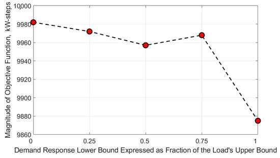 To investigate the effect of incorporating demand response, the base case of Section 5.1 is re-run with varying lower limits of load controllability for the 10 loads with demand response. This is summarized in Figure 7.
