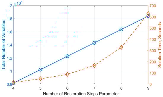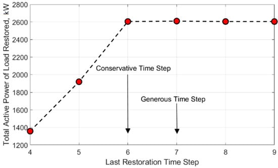 The choice of the number of restoration steps is an important parameter in determining if the restoration solution optimally utilizes the available local resources. A choice of a lower number of restoration steps can lead to a sub-optimal solution while a choice of a larger number can lead to a better solution but at the cost of increasing the number of variables and constraints (in other words, decreasing the compactness of the model). To study the effects of the choice of restoration steps on the base case, the graph analysis approach presented in Section 4 is applied to the base case of the microgrid shown in Figure 3. The resulting conservative and generous time steps were estimated as 6 and 7, respectively. The base case is then re-solved with varying restoration steps ranging from 4, 5, 6, to 9 time steps. The total active power of load restored at the last step is presented in Figure 8.