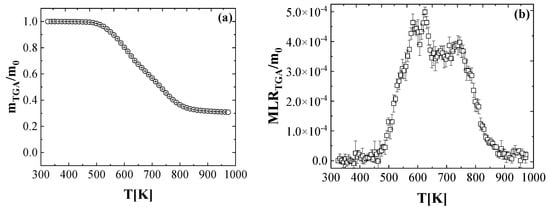 Figure 2 presents the mean mass data and the MLR data collected in the TGA tests conducted at a heating rate of 10 K min−1. These data were normalized by the initial mass of the sample. The error bars were calculated as two standard deviations of the mean, were also shown in the figure to demonstrate the uncertainties of the experimental data. The error bars in the mass loss data are difficult to discern because they are comparable in size to the data symbols.