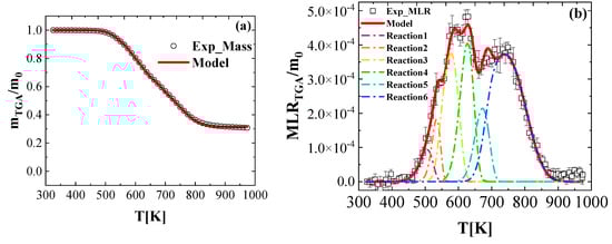 Figure 3 shows the comparison between the experimental and predicted TGA curves. It also includes the contributions of the individual reactions to the total MLR. As we can see, the overall mass loss profile was well captured. Additionally, the temperature and magnitudes of the MLR peaks were predicted reasonably well, within the experimental uncertainties.