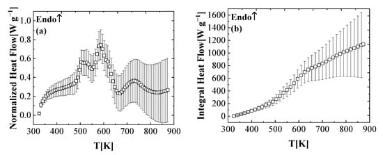 Experimental DSC data collected in nitrogen at a heating rate of 10 K min−1 presented as (a) normalized heat flow and (b) integral heat flow.
