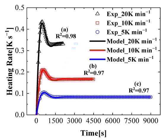 The actual heating program in the test cannot reach the set heating rate immediately [37]. The heating rate increases to a higher rate and then gradually decreases to the set heating rate, so an exponential decaying trigonometric function (shown in Equation (19)) was used to fit the experimental heating program. First, the actual heating rate curve at 10 K min−1 was fitted using Equation (19). The same fitting exercise was performed for the data obtained at heating rates of 5 K min−1 and 20 K min−1. The fitting curves for each heating rate case (5 K min−1, 10 K min−1, and 20 K min−1) are shown in Figure 5. As we can see, the R-squared values of all three cases are above 0.97, which indicates a good agreement between the experimental and fitted curves. Parameters to are shown in Table 2. Note that the data at 60 K min−1 in Table 2 represent the fitting results for the actual MCC tests.