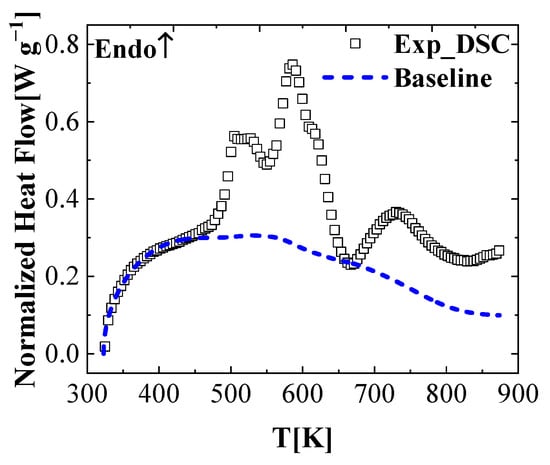 These capacities are used to compute a sensible heat flow baseline, HFbase. In the calculation process, the (heat of the reactions) of six reactions of the ThermaKin2Ds are set to zero to ensure that the baseline results from the heat capacity of the material itself. This baseline is calculated as a function of the sample temperature, as shown in Equation (20).