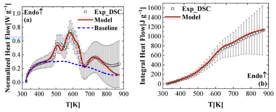 The average normalized heat flow shown in Figure 4a can be represented using Equation (18). It consisted of two parts, the sensible heat of the component and the heat of the reaction. in the equation represents the instantaneous heating rate of the sample. Therefore, in order to reasonably reproduce the heat flow, itis important to fit the heating rate of the actual heating rate of the DSC tests [28,37,38].