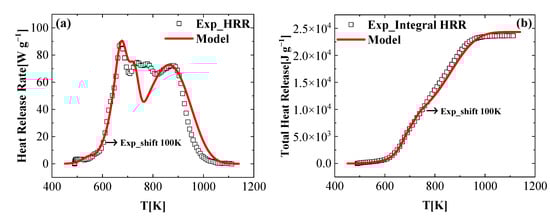 Note that due to the sample temperature deviations from that measured by the MCC sensor, the MCC experimental curves were corrected and shifted to a higher temperature region (completely moved 100 K, to the right) to match the simulation results using the developed reaction mechanism in Section 4.1, as shown in Figure 8. Initially, the same was applied to each gaseous product to generate the HRR curve. Subsequently, of each gaseous product was adjusted to better capture the experimental HRR profile. This iterative process continued until the differences between the modeled and experimental data satisfied the specific criteria. The criteria [38] was defined as the HRR maxima were predicted within 10% accuracy, the temperatures of the HRR maxima were predicted within 10 K, and the final integral HRR values were predicted within 10%. The modeling results captured the initial rise and peaks of the HRR profile. The experimental final THR was also well reproduced by the simulation. Note that there was a discrepancy of the HRR profile at a temperature range of 726 K to 813 K. Considering the relatively complex reaction mechanism and the relatively high heating rates used in the MCC tests, the simulated results agreed with the experimental data, reasonably. The result of the heat of the combustion that satisfy these criteria are given in Table 4. The final simulated MCC results are shown in Figure 8.