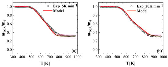 The reaction mechanism shown in Equations (12)–(17) and the corresponding parameters reported in Table 3 was developed using the TGA data collected at the nominal heating rate of 10 K min−1. To further quantify the generality of the developed reaction model and the reaction kinetic parameters, they were used to simulate the TGA experiments conducted at a lower heating rate of 5 K min−1 and at a higher heating rate of 20 K min−1.