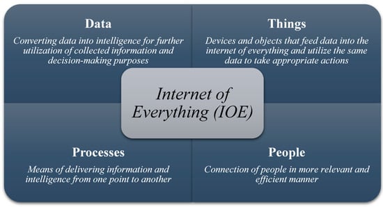 Before the commencement of this survey, it is necessary to clarify three terminologies that are frequently used in the literature: (1) Internet-of-Everything (IOE), (2) Internet-of-Things (IoT), and (3) Internet-of-Energy (IoE). The IOE, as shown in Figure 3, expresses a broad range of meanings, including the IoT. Nevertheless, the IoT and IoE have been used interchangeably on many occasions to convey similar conceptual ideas, yet hold their differences in terms of field applications. The IoE has a five-layered architecture with respect to its functionality: (1) infrastructure layer, (2) networking of energy internet, (3) energy router, (4) smart energy management system, and (5) smart terminals [23,24,25]. This study focuses on the IoT, which aids the efficient management of energy systems.