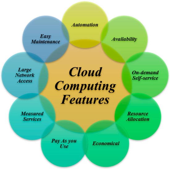 - Cloud computing: Cloud computing can handle big data’s networking, storage, and computational needs and offers extensive application services. Cloud computing, with the help of virtualization technology, can combine hardware and software resources from several geographical areas to establish a virtual platform with powerful storage and processing capabilities. It is important to emphasize that cloud computing is critical for enabling common, suitable, and on-demand network access to a distributed group of configurable computing resources, which can be automatically provisioned and released with minimal effort on the part of service providers. The term “cloud” is often used to characterize data centers that are scattered across several geographic areas and can be made available to many customers over the Internet. Cloud computing allows large data storage and extremely dependable, scalable, and autonomous processing. Cloud services are used to aggregate data and information from various elements, such as sensors, appliances, and other devices. They also process and analyze the collected data and provide the results to consumers and service providers for more insights. Different features of cloud computing are shown in Figure 5 [31].