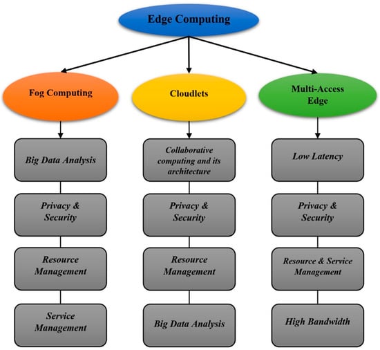 - Edge computing: Edge computing refers to the deployment of distributed intelligent agents at the edges of the network and closer to IoT-enabled devices to provide computation, storage, and application services near data sources. Although cloud computing can provide the required computational capabilities to the smart grid, the central cloud is located at a large distance from the data source, resulting in lengthy latency. However, many electricity applications and services could benefit from offloading computational and storage tasks to the proximity of IoT-enabled devices, which results in much lower service response latency and a reduction in communication overhead and traffic load to the central network, and an improvement in context-awareness. The offloading of computational tasks to the embedded resources available on IoT devices is known as edge computing. However, for some applications, the computational power in embedded devices is not sufficient, and the latency of the cloud is intolerable, which brings in the necessity for a processing layer between the network’s edges and the cloud, known as the fog server. Nevertheless, the computational capacity of fog servers is far less than that of cloud servers. To overcome this limitation, the architectural standard of multi-access edge computing (MEC) has been proposed for IoT applications, aiming to move cloud resources to the edge of a network. The edge computing classifications are depicted in Figure 6 [38,39]. Peak-load shifting and real-time load–demand balancing to provide optimal options for power generation scheduling are examples of using edge computing proposed in smart grid applications [40].