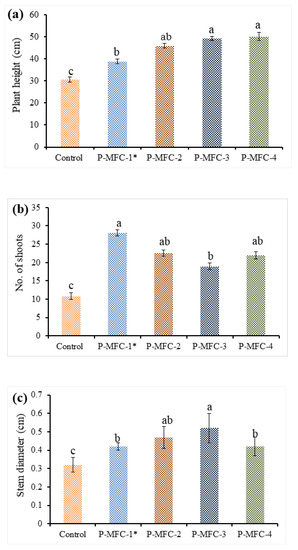 Effect of P-MFC on Stevia rebaudiana growth parameters: (a) plant height (cm); (b) number of shoots; (c) stem diameter (cm). Means with the same letter for each figure is statistically equal (Tukey, p < 0.05).