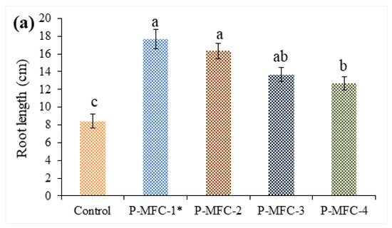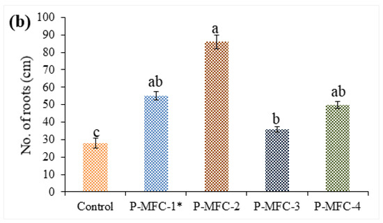 Impact of the P-MFC on the Stevia rebaudiana rhizosphere: (a) root length (cm), and (b) number of roots during the study. Means with the same letter for each figure are statistically equal (Tukey, p < 0.05).