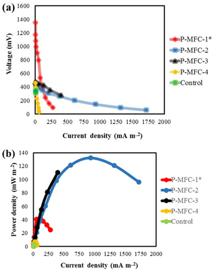 On the other hand, Figure 3a presents a typical graph of the polarization curves obtained in this study. Higher average energy efficiency was achieved in P-MFC-2, with a value of 931 ± 15.1 mA m−2 when it was inoculated with cow urine, compared to the other P-MFC reactors evaluated in this experiment. Lowest average power generation was exhibited by the control (without plant), achieving a current density of 10 ± 0.08 mA m−2. Figure 3b depicts the performance of power–density curves in this study. It can be observed that the same reactor (P-MFC-2) indicated the highest performance of 132 ± 11.6 mW m−2. This result was higher compared to those reported in previous studies [11,26,28,50,54]. However, in a recent study by Li et al. [55], higher maximum power densities of 1613.3 ± 155.5 and 1185.1 ± 29.1 mW m−2, respectively, were reported in microbial electrochemical systems by optimizing the “anode-collector”. This was a good strategy to increase the performance of the reactor. Hence, Li et al. found that integrating a metal–current collector into the anode electrode was an effective strategy for reducing the power loss of the system. Previous results were higher than those found in our study. This difference was due to the types of systems employed in both studies. Also, the lowest performance was achieved in the control, which yielded a power density of 0.35 mW m−2. The same phenomenon was observed previously, by evaluating the performance of P-MFC embedded with Opuntia spp. under open-field conditions [11,25].