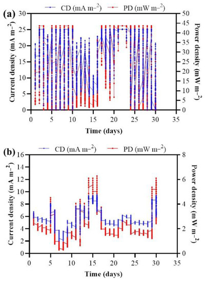 On the other hand, the low generation of bioelectricity in the control could be attributed to a factor such a low OM content, which influences the activity of the bacterial community on the surface of the anode electrode. Low activity of microorganisms in the environment of the bioelectrochemical system gives rise to a total decrease in the production of bioelectricity. This comprises the explanation that we are able to offer concerning this phenomenon. However, there is no doubt that other, unknown factors could cause the low performance of the control.