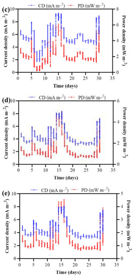 Current–density and power–density curves in (a) P-MFC-2, (b) P-MFC-1*, (c) P-MFC-3, (d) P-MFC-4, and (e) control reactors for 30 days. Note: CD—current–density; PD—power–density.