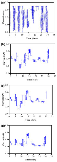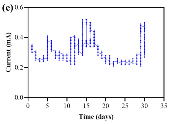 Current values obtained during the 30 days of the monitoring of reactors (a) P- MFC-2, (b) P-MFC-1*, (c) P-MFC-3, (d) P-MFC-4, and (e) Control.