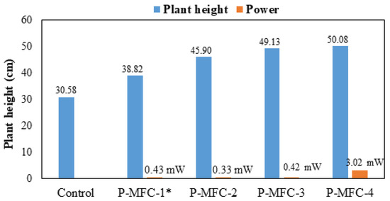 The results of power and plant growth are presented in Figure 6. It can be observed that P-MFC-3 and P-MFC-4 showed highest power, respectively, at this stage of study. The power output found in those reactors were 0.42 and 3.02 mW, respectively. For the evaluation of the impact of power generation on plant’s height, it can be observed that this influenced plant growth during the operation of P-MFCs. Being P-MFC-4 the reactor with the highest power and plant height. However, the control plant turned to be the reactor with the lowest height value in this experiment. In contrast, previous studies demonstrated that the control plant turned out to be shorter in terms of height [11,25]. In addition, power generation had a significant effect on the number of roots, as well as on the length of the roots. According to Arulmani et al. [27] plant roots grow deeper in the anode compartment; this has been confirmed in this study. Furthermore, all of the plants grew on the P-MFC. The same phenomenon was observed by Sudirjo et al. [28]. It can be argued that the anode had a significant effect on the plant development process, because the presence of the anode in the plant’s rhizosphere attracts the microorganisms that participate in the plant’s nitrogen fixation process. Also, EC is a key factor in the absorption of nutrients by plants.