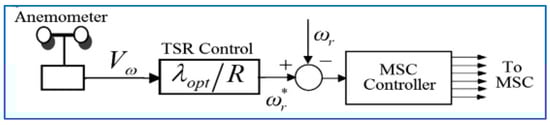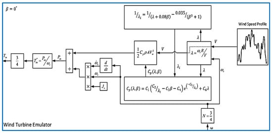 where 𝑃in and 𝑇in reflect the power and torque of the turbine at the supply, respectively; 𝐶p is the power coefficient of the turbine (=0.593 is max); 𝐽r is the turbine’s moment of inertia; 𝜔r is the turbine’s speed; A is the area covered by the turbine’s rotor; λ represents the tip speed ratio (TSR); and β reflects the pitch angle, which is anticipated to be a null value as the turbine is developed at a lower wind speed. The signals at the input of the system are the wind speed, inertia of rotor, and synchronous machine speed. The outcome is the turbine’s torque. Wind turbines of variable speed are dominant due to their ability to extract high voltages from the wind. This can be attained using MPPT methods such as TSR with a PI regulator which also enhances efficacy.