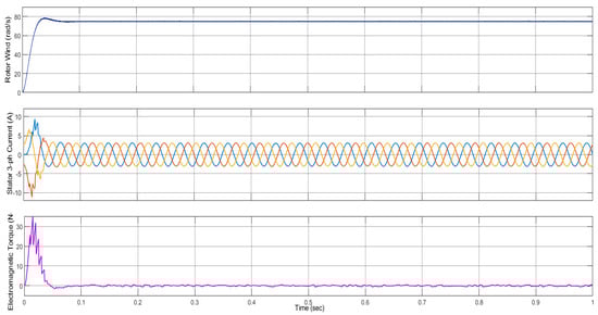 The prime speed ‘wr’ of the generator is attained using the TSR method and ‘wr*’ is the reference speed is presented in Figure 5. Furthermore, a PI controller is linked to maintain the generator operation at the desired velocity. The outcome of a PI regulator is subtracted from a switching wave when a converter’s duty ratio is obtained. Gate pulses drive the control of the switching devices of the rectifier at a suitable firing angle via a control network. Hence, maximum power is achieved by varying the value of D. The simulation results of WECS are shown in Figure 6.