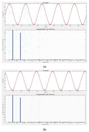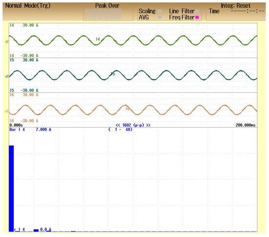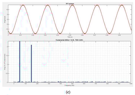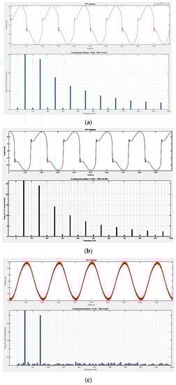Figure 8a–c project the graphs of the load currents and the associated THD bars. Figure 9a–c demonstrate that the simulation performance and the THD at the source terminal were lower than 3%. So, the developed model adheres to the IEEE 519 protocol. A 19% THD is obtained at an A-ph load, 32% THD is observed at the B-phase and 6% THD is observed at the C-phase. In contrast, the THDs of the three legs at the supply terminals are nearly 2%, enhancing the source side PQ with varied loads with an ANN controller.