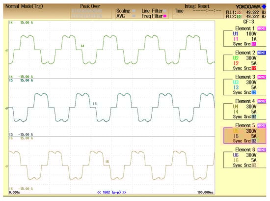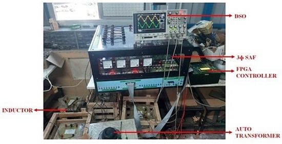 The established scheme was formulated using a dSPACE setup for a balanced loading scenario, as reflected in Figure 10. The FPGA controller generates the required gate commands for all six IGBT switches of the grid inverter to accomplish the desired performance, with a sampling time of 10 microseconds which is required to execute the developed control algorithm. This unit includes the hardware outputs of the Adaptive Learning Back Propagation-Based Control Algorithm for a three-phase three-wire system addressing a non-linear balanced load. The specifications of the experimental setup are presented in Table 3.