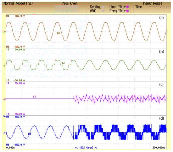 From Figure 11, it can be seen that when DSTATCOM was activated, it started sending the compensation current; hence, the source current became sinusoidal. Before using DSTATCOM, the non-sinusoidal current can be observed at the source side, which is similar to the currents drawn by the non-linear load. The variation in the quality of the source current reflects the enhancement of THD at the supply side.