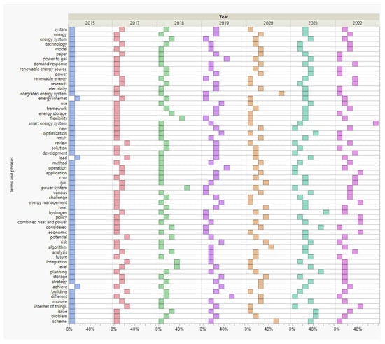 The increased relevance of strategic topics, especially “cost” and “policy”, is reflected in the development of key concerns of the literature by highlighting which terms were featured more prominently in which year (Figure 3). It is because “cost” and “economic” also show a steady rise in terms of appearance. Similarly, the changes in the appearance rate of “policy” mean that, besides the technological considerations, the utilization of innovative technologies and energy systems can affect or require effect from the social and political sphere as well. The terms most prominently featured in 2022 are likely to define research in the near future. “Smart energy system” appeared at a rate of 71% in 2022, suggesting that the research area is moving towards digitalization, integration and decentralization. In addition, while the appearance of “power to gas” and “hydrogen” decreased in 2022, “gas” was more apparent, which could indicate growing interest towards P2M processes and producing synthetic natural gas.