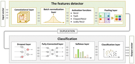 As can be observed in Figure 1, the four layers included in the detector set are the convolutional layer, batch normalization layer, activation function (ReLU), and pooling layer. Definition of the fault category based on the detected features of input matrices is possible thanks to the use of the set consisting of dropout, fully connected, softmax, and classification layers.