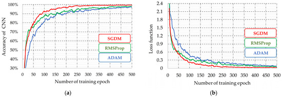 As observed in Figure 2, the use of the Adam adaptive learning algorithm results in reduced dynamics of the process. Moreover, the system precision achieved, calculated for the test data, is lower than in the case of using the RMSProp algorithm (difference of about 0.5%). The use of the RMSProp algorithm was characterized by the high dynamics of the training process in the first stages of learning, comparable to the application of the SGDM method. However, the final value of the loss function was noticeably higher than in the case of SGDM, which corresponded to the lower precision of the system. During the analysis of the influence of the learning method on the CNN effectiveness, the same network structures, training, and testing data sets were used.