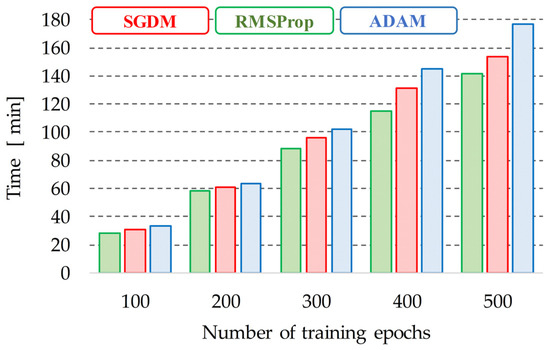 The use of the SGDM algorithm in the developed systems based on CNNs was a compromise between the high precision of the training process and the short learning time. As can be seen in Figure 3, with the increase in the number of learning epochs, the difference in learning time between particular algorithms increases.
