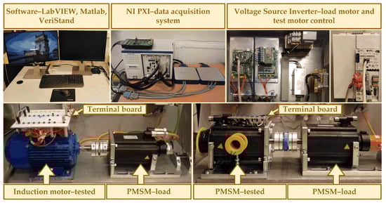 The tested drive system with PMSM motor, shown in the RHS of the lower part of Figure 4, consisted of two mechanically coupled machines with a power of 2.5 kW (tested motor—Lenze MCS14H15) and 4.7 kW (loading machine—Lenze MCS14H32) powered by industrial frequency converters by Lenze. The control of the tested motor, as well as the regulation of the load torque values, was performed with the use of the VeriStand and Lenze Studio environments. Acquisition of the measurement data was carried out using the NI PXI 8186 industrial computer equipped with a DAQ NI PXI—24472 measurement card with high resolution.